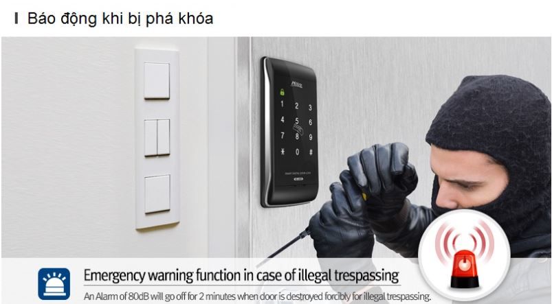 | Báo động | Chức năng báo động trường hợp cạy cửa hoặc phá khóa |